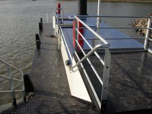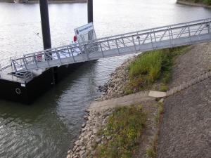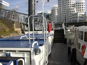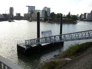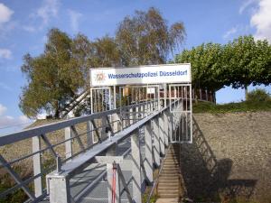 Für die Wasserschutzpolizei NRW wurde im Hafen Düsseldorf im Jahr 2002 eine neue Anlegestelle errichtet. Die Anlage besteht aus einer Zugangsbrücke (L/B = 1.75/26.00m) und einem Anlegeponton (L/B = 20.00/5.00m). Die Anlage wird über zwei Führungsdalben verankert und passt sich den wechselnden Wasserständen automatisch an.
