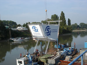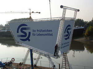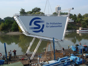 Errichtung eines überdimensionalen Einkaufswagen auf einem Ponton zur ANUGA 2005 für die Fahrt auf dem Rhein.