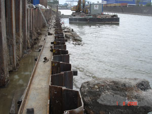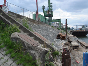 Im Auftrag der Firma Hülskens Wasserbau aus Wesel habe wir für die Baumaßnahme "Sanierung der bestehenden Ufermauer" im Osthafen Frankfurt am Main "Mannheimer Werft" (Südbecken) die statische Berechnung sowie die Ausführungzeichnungen erstellt.